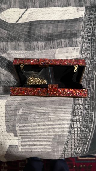 Espectacular bolso de fiesta tipo clutch rígido con glitter rojo multicolor. Perfecto para Navidad, Nochevieja y eventos especiales. ✅ CARACTERÍSTICAS: Tipo: Clutch box rígido Color: Rojo glitter multicolor (dorado, azul, fucsia) Cierre: Metálico dorado de calidad Cadena dorada desmontable incluida Interior negro con bolsillo Medidas aprox: 18x10x5cm Capacidad: móvil, llaves, pintalabios, cartera pequeña 🎄 PERFECTO PARA: Cenas de empresa Nochevieja 2024 Bodas y eventos Regalo Navidad
