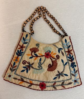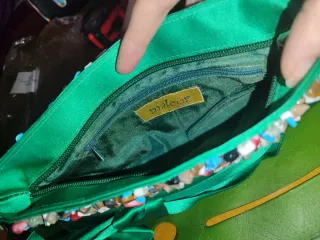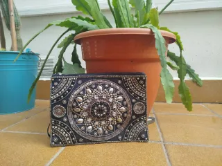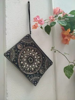 Elegante bolso de fiesta traído directamente de la India. Una pieza artesanal y única, confeccionada con materiales de calidad y bordados a mano con gran detalle. Ideal para eventos especiales o celebraciones donde quieras destacar con un toque exótico y elegante.