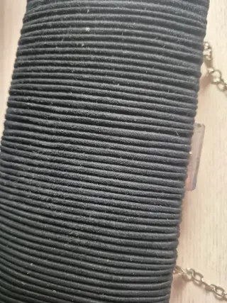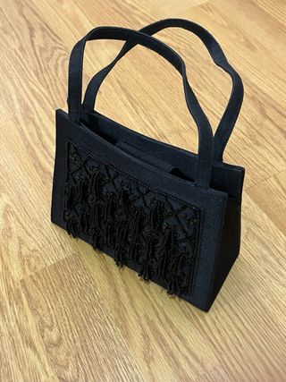 Elegante bolso de tela negro adornado con lentejuelas y detalles ovalados. - Cierre de cremallera le falta el tirador como se ve en la foto, se puede abrir y cerrar perfectamente - Tira con corchete para asegurar. - Diseño con varias filas de lentejuelas.