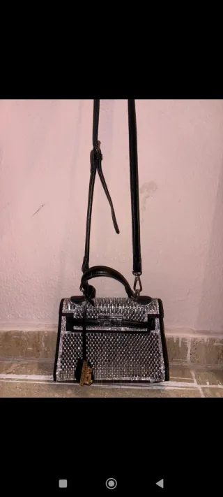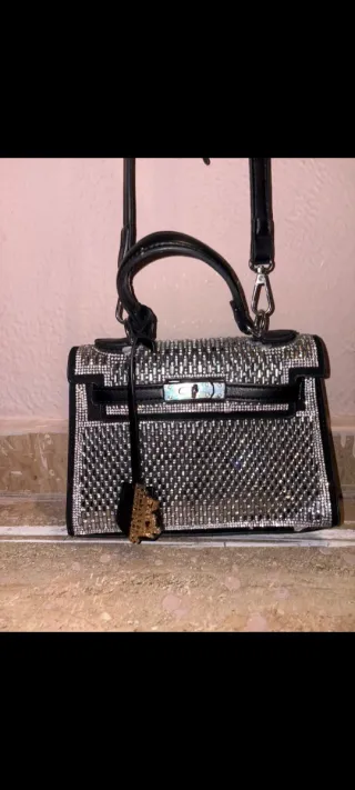 Elegante bolso de mano adornado con pedrería brillante. - Diseño llamativo con detalles plateados. - Asa superior y correa desmontable. - Cierre de seguridad metálico. - Incluye charm decorativo.