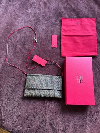 Elegante bolso de fiesta de Carolina Herrera. - Diseño con monograma CH. - Detalles multicolor. - Incluye caja y funda guardapolvo.