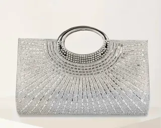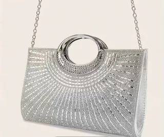 Elegante bolso de mano tipo clutch, perfecto para eventos y fiestas. Su diseño con pedrería le da un toque brillante y sofisticado. - Acabado con pedrería tipo strass. - Cadena metálica plateada para llevar al hombro o cruzado.