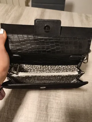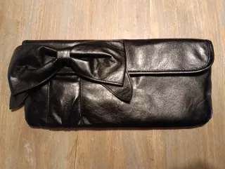Elegante bolso de mano negro, perfecto para ocasiones especiales. Su diseño cuenta con un coqueto lazo decorativo en la parte frontal. - Cierre de solapa. - Material: PVC con tacto de piel Tiene bolsillo interior con cremallera y hueco para el móvil