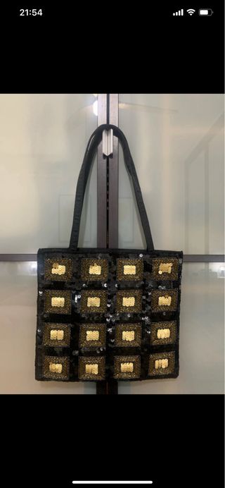 Elegante bolso de mano con un diseño llamativo. - Acabado con lentejuelas negras. - Detalles cuadrados en dorado.