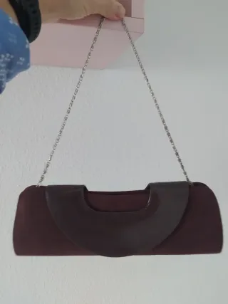 Elegante bolso de mano. Se vende bolso totalmente a estrenar aún con plásticos. Incluye cadena plateada para colgar que se guarda si solo lo quieres llevar de mano. Medidas 20cms de alto x 22cms largo y 8cms de ancho.