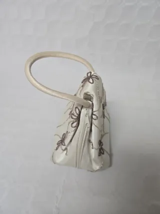 Elegante bolso de mano para ocasiones especiales. - Diseño con bordado floral. - Asa redonda. - Acabado satinado.
