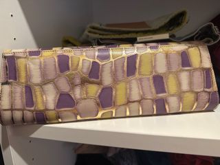 Elegante bolso de mano, perfecto para ocasiones especiales. Su diseño combina tonos morados y dorados, aportando un toque de sofisticación. - Cadena dorada para llevar al hombro o cruzado. - Acabado aterciopelado.