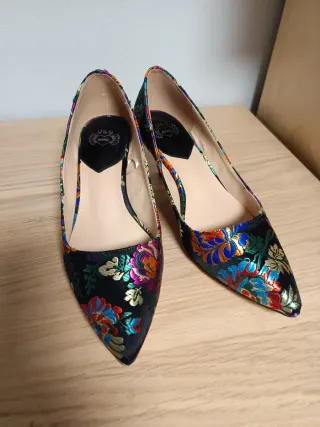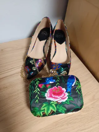 Elegante conjunto de zapatos de fiesta y bolso de mano con un diseño floral y de aves bordado en tela de seda. Puestos solo en una ceremonia a juego con un mantón de Manila. - Zapatos de tacón bajo con estampado floral. - Bolso de mano tipo clutch con cadena dorada. - Diseño bordado detallado en ambos artículos.