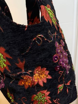 Elegante bolso de fiesta con un diseño bordado. - Base negra con detalles florales y de uvas. - Bordado multicolor con lentejuelas. - Asa curva para llevar en la mano o antebrazo.