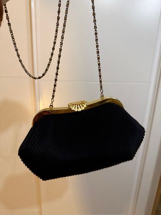 Elegante bolso de mano con un diseño plisado y detalles metálicos. - Acabado en color negro. - Cierre y adornos en tono dorado. - Cadena metálica para llevar al hombro o cruzado.