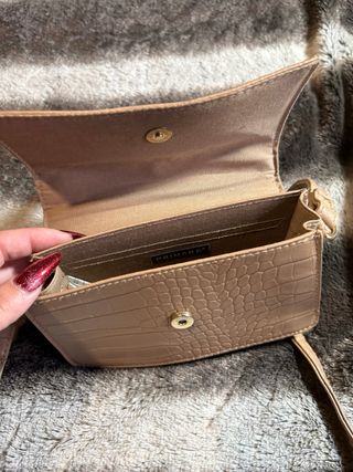 Bolsito de fiesta de pelo beige. Viene con dos productos de maquillaje: Una paleta de iluminadores y un gloss. Tiene una cadena para llevarlo colgado. Está sin estrenar,viene con el precinto de fábrica ,la última foto pertenece a otro bolso en uso Edición limitada de Navidad, viral en tik tok