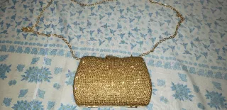 Elegante bolso de mano (clutch) con pedrería dorada y cadena de hombro, adecuado para fiestas o eventos formales. perfecto para ocasiones especiales. - Diseño cubierto de pedrería brillante. - Cadena dorada desmontable. - Cierre de clip metálico.