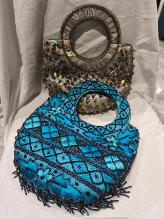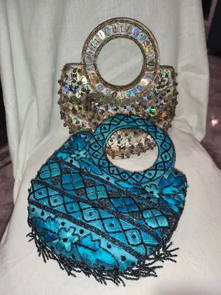 Elegantes bolsos de fiesta, perfectos para complementar tu atuendo. - Un bolso plateado con detalles de abalorios y lentejuelas. - Un bolso azul con bordados y flecos.