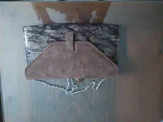 Elegante bolso de mano con un diseño llamativo. - Acabado tipo piel de serpiente. - Detalle frontal en ante. - Cadena metálica para llevar al hombro.