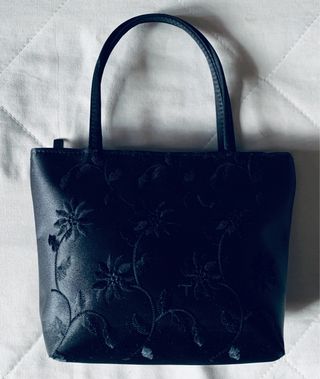 Elegante bolso de satén con un delicado diseño de flores bordadas, perfecto para ocasiones especiales. - Tejido de satén. - Detalle de flores bordadas. - Asa cómoda para llevar en la mano. Alto 16 cm Ancho máximo 34 cm Fondo 8 cm