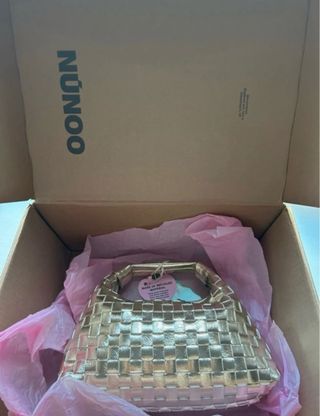 Bolso de mano con un diseño tejido y acabado brillante. - Material: Hecho de material reciclado. - Color: Dorado metálico. - Estilo: Tejido a cuadros.