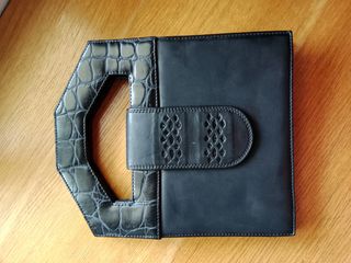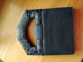 Bolso mano elegantísimo compartimentado, asa dorada y cierre.