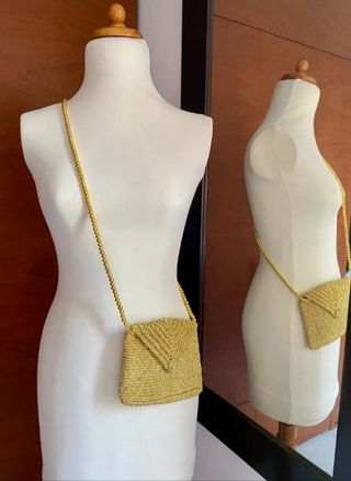 Elegante bolso de fiesta en tono beige dorado mate. Ideal para eventos especiales. - Diseño con detalles brillantes. - Asa para llevar cómodamente en la mano, y cuerda interior para llevar en el hombro. - Perfecto estado, listo para usar.