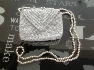 Elegante bolso ideal para eventos o fiestas. Es de color plata y blanco, en cota de malla. - Tiene cierre de broche. - Material brillante y textura única. Como se aprecia en una foto el interior en una esquina está un poco despegado.
