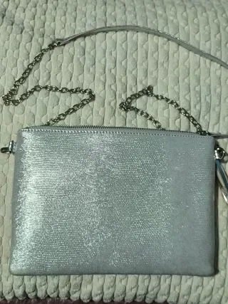 Bolso pequeño de mano con cadena en color plata q se puede quitar.