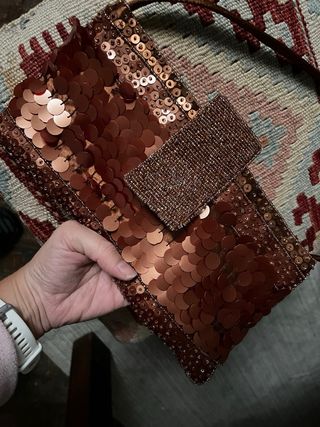 Elegante bolso de fiesta adornado con lentejuelas. - Color marrón y dorado. - Diseño con solapa y cierre. - Asa de mano.