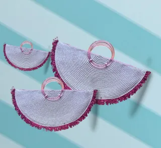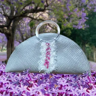 Elegante bolso de mano plateado, perfecto para eventos o para darle un toque veraniego a tu look. - Diseño semicircular. - Asa de aro transparente. - Adorno central con cuentas fucsia y detalles blancos.