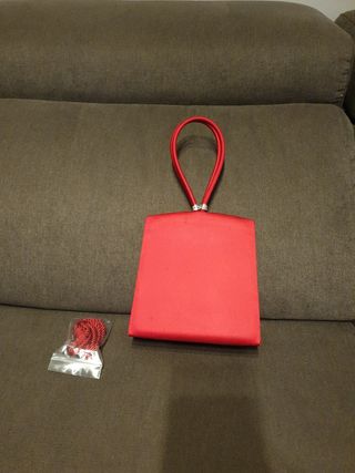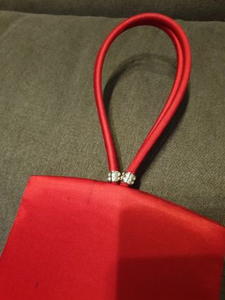 Bolso pequeño de fiesta rojo. Con asas de mano y cordón para colgar. Tiene varias manchas en la parte trasera .