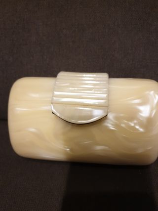 Bombonera color nácar, con cuerda para colgar. Con caja original.