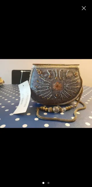 Elegante bolso de mano para ocasiones especiales. - Diseño intrincado con abalorios. - 21 x 13,5 aprox sin contar el asa. - Cierre de broche dorado. - Asa de mano corta. - Etiqueta interior "Made in Japan"