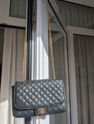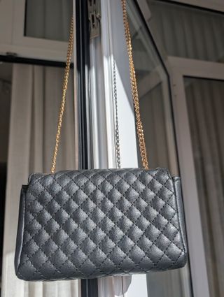 Elegante bolso negro perfecto para eventos especiales. Recoger en persona. - Ancho: 18 cm. - Cadena dorada. - Diseño acolchado.