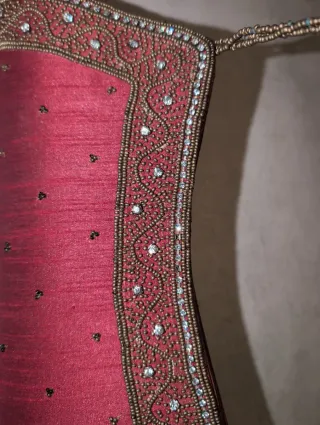 Elegante bolso de mano tipo joya, perfecto para ocasiones especiales. Su diseño combina terciopelo burdeos con un frontal adornado con pedrería y detalles plateados. - Material exterior: Terciopelo. - Adorno frontal: Pedrería y abalorios. - Cierre: Broche de presión metálico. - Asa: Detalle de terciopelo.