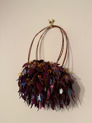Elegante bolso de mano adornado con lentejuelas en forma de plumas. Chiquitito y perfecto para la temporada de bodas.