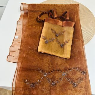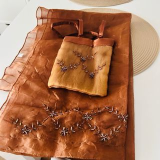 Conjunto de foulard y bolso de fiesta. - Foulard de tela fina con bordados florales. - Bolso a juego con detalles bordados. - Cierre de cinta.