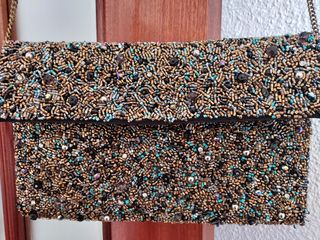 Vendo cartera de fiesta en tonos dorados, la parte de atrás dorada lista para no enganchar la ropa. Nueva.