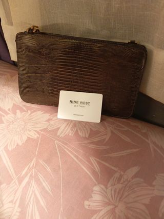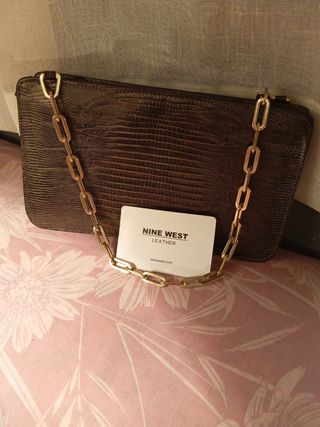 cartera de mano o clutch,,de preciosa piel color verde seco y tornasol dorado. con cadena de eslabón grande y abierto dorada. mucha clase y estilo. interior de raso, cierre de cremallera y bolsillo interior de cremallera también. Nuevo, a estrenar... firmado por Nine West, bolso y cadena. Oportunidad de hacerte con un artículo de lujo a buen precio