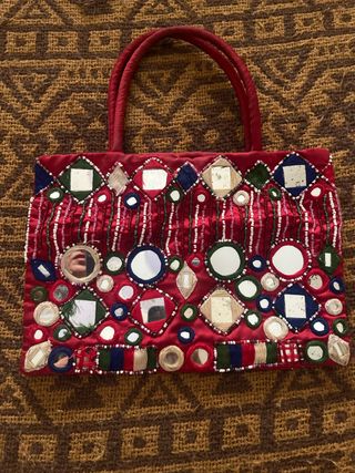 Elegante bolso de mano, perfecto para ocasiones especiales. - Diseño vibrante con bordados y aplicaciones de espejos. - Detalles de cuentas y hilos de colores. - Asas cómodas para llevar en la mano.