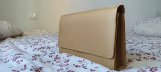 Elegante cartera de mano en tono dorado, perfecta para complementar tu atuendo en eventos especiales. - Acabado satinado. - Diseño tipo sobre.