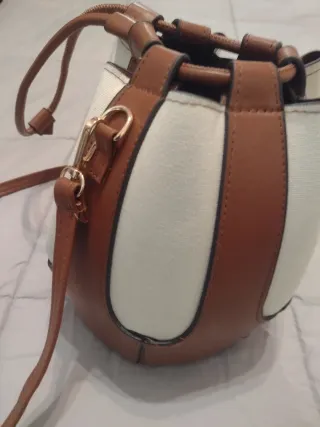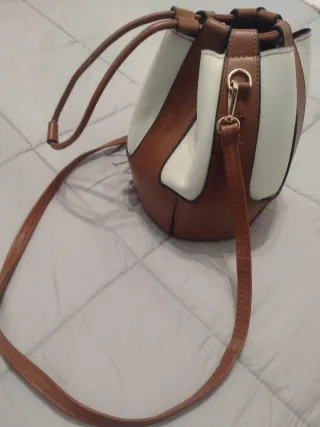 Bolso estilo bombonera con un diseño moderno. - Combinación de colores marrón y blanco. - Cierre de cordón. - Asa de mano y correa. - Detalle de costuras.