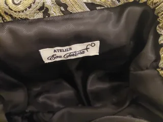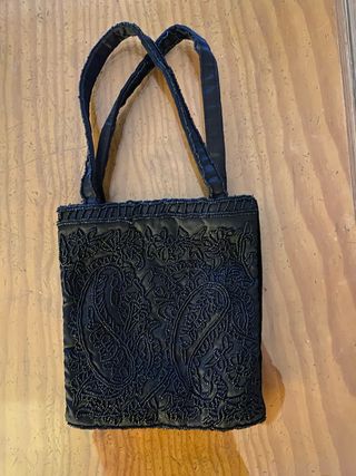 Elegante bolso de mano con un diseño llamativo, perfecto para complementar tu atuendo de fiesta. Diseño y edición limitada. Elaborado en mi taller. NUEVO. Si buscas algún tono en especial, háblame y lo elaboramos personalizado. - Tejido jacquard - Acabado con estampado paisley. - Cierre seguro. - Forrado en raso de seda negro.