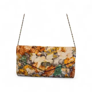 Elegante bolso de mano con un estampado floral vibrante en tonos amarillos y un cierre metálico dorado. - Diseño tipo sobre. - Cadena de metal para llevar al hombro. - Acabado con textura.