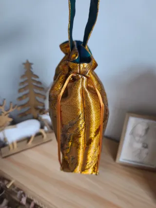 Elegante bolso de mano con un diseño único y llamativo. - Acabado brillante en tono dorado. - Interior forrado en tela verde. - Cierre de cordón ajustable. - Asa de tela a juego.