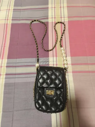 Bolso pequeño ideal para eventos o fiestas. Su diseño combina elegancia y un toque moderno. - Acabado acolchado. - Cierre metálico dorado. - Cadena dorada entrelazada con tela negra. - Adorno de perlas en la cadena.