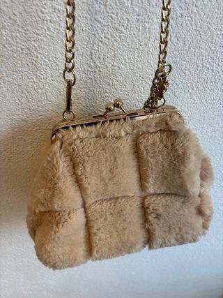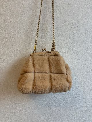 - Material: Piel sintética de peluche suave y acogedora. - Color: Beige/rosita claro, fácil de combinar con cualquier atuendo. - Diseño: Estructura acolchonada con compartimentos que le dan un toque moderno y elegante. - Cierre: Metálico dorado, fácil de abrir y cerrar. - Cadena de eslabones dorados, perfecta para llevarlo al hombro o en la mano. - En perfecto estado, casi nuevo. - Ideal para: Look de invierno, eventos especiales o para quienes buscan un accesorio único y llamativo. - Medidas: 20x25cm aprox - Comprado en una tiendecita en Valencia. Costó 30€, lo dejo en 12€