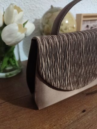 Precioso bolso de fiesta, color marrón, completamente nuevo. - Diseño elegante y sofisticado. - Confeccionado en un tejido tela combinando plisado y liso. - Asa de mano cómoda y disponible otra para colgar.