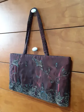 Elegante bolso de seda con un diseño intrincado. Color granate/vino - Adornado con bordados dorados - Incorpora lentejuelas color plata. - Color principal granate/vino. Medidas 15'5x9 cm Usado una única vez. Estado del bolso, impecable.