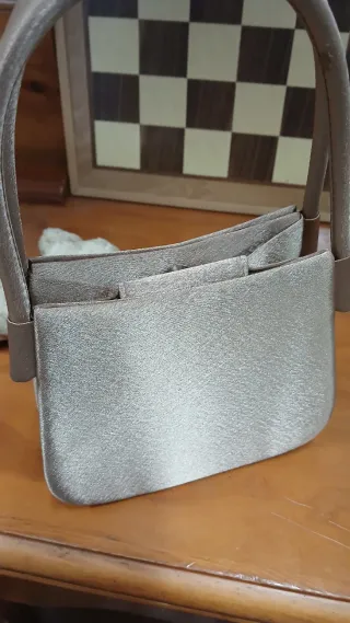 Bolso gris metalizado para celebración. Se puede llevar colgado o tipo cartera.