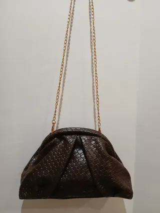 Elegante bolso de fiesta en tonos marrones y apliques dorados. Está sin estrenar. Ideal para eventos especiales. - Diseño con lazo decorativo. - Cierre de broche. - Cadena dorada para llevarlo al hombro.