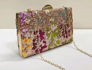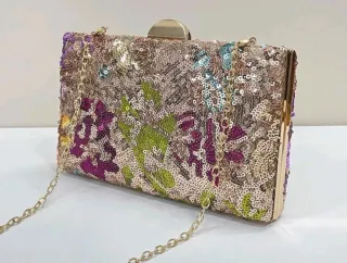 Elegante bolso de mano tipo clutch, perfecto para ocasiones especiales. - Diseño con lentejuelas y motivos florales. - Cadena dorada para llevar al hombro. - Marco y cierre metálicos dorados.