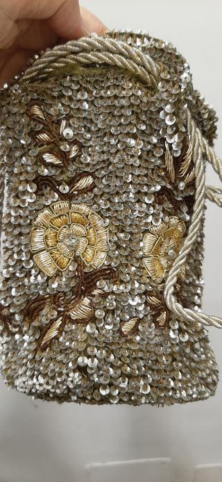 Elegante bolso de mano adornado con lentejuelas. - Diseño cilíndrico. - Bordados florales en tonos dorados y marrones. - Cierre con cordón trenzado. - Adornos de lentejuelas brillantes.
