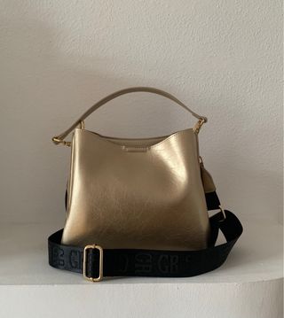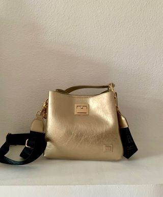 Sin estrenar. Impecable. Dorado con el asa negra. Medidas: ancho 22 x alto 16 x fondo 10
